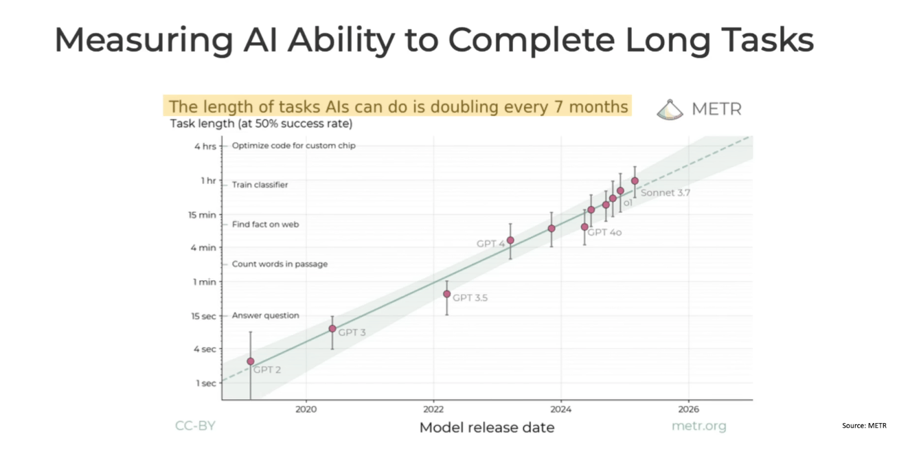 According to METR's research, which Yoshua Bengio presented in his TED Talk, the length of tasks AIs can complete is doubling every 7 months. From answering simple questions in seconds to optimizing code for hours. This exponential growth in AI agency sounds exciting for productivity, but Bengio raises a critical concern: as these systems take on longer, more autonomous tasks, our ability to oversee and correct them diminishes. The same capability that lets AI work through the night also means more time for things to go wrong without human intervention.